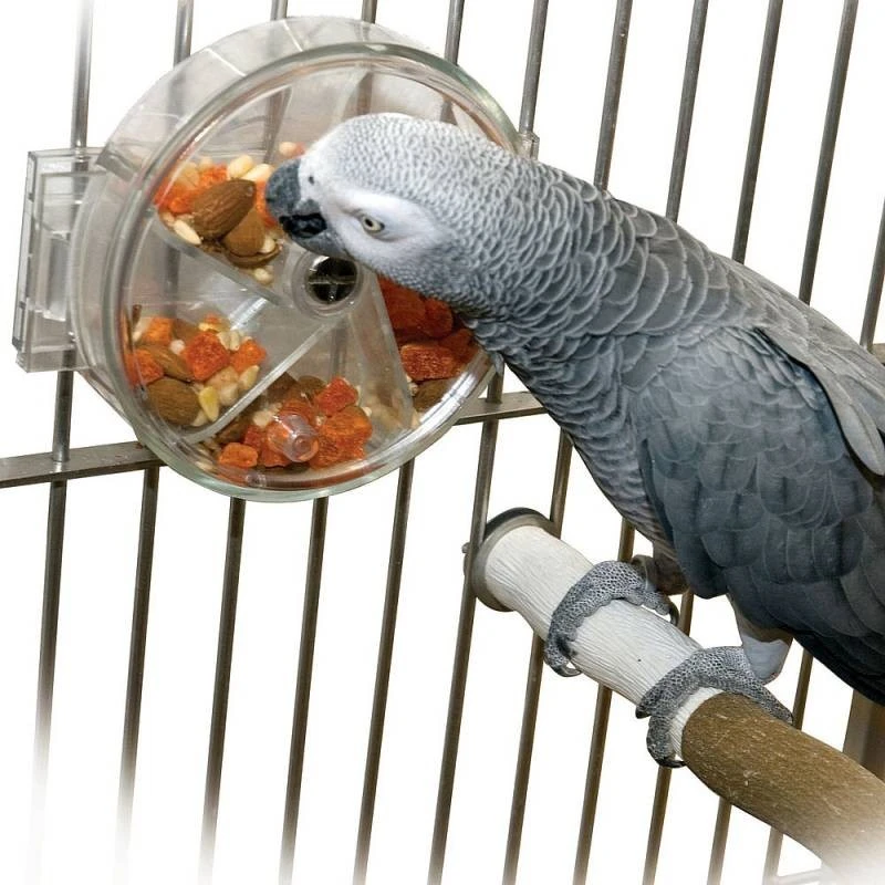 Remplissez la roue de nourriture avec des bonbons ou (une partie de) sa nourriture quotidienne. L’oiseau tourne la roue, puis il y a une ouverture au niveau de la nourriture et il obtient sa rĂ©compense.